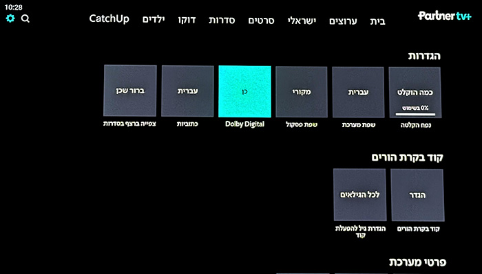 מסך הגדרות כולל הגבלת גיל צפיה, קוד בקרת הורים, נפח הקלטה, שינוי שפה לממשק וגם לשמע ולכתוביות, צפייה ברצף בסדרות והפעלת שמע מתקדם.