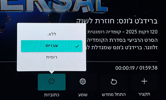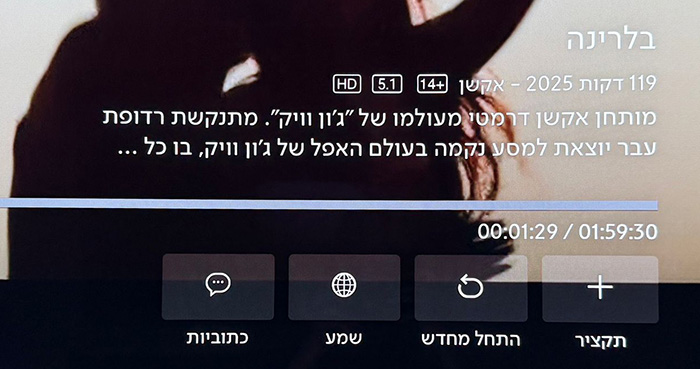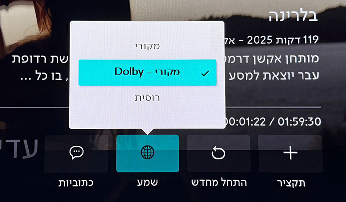 במסך הכותר תוכלו למצוא תיאור לתוכן עם אפשרות לשנות שפה (בחלק מהתוכנים), מידע על שמות השחקנים, זמן וסוג השמע והתמונה.