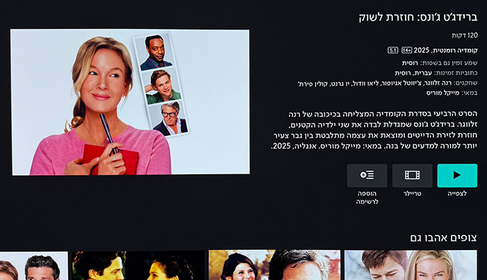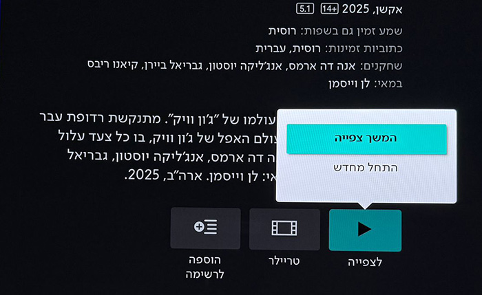 כמו כן תוכלו להפעיל טריילר (אם זמין בתוכן), הוספה לרשימה שלכם וצפייה עם האפשרויות: המשך צפייה או להתחיל מחדש.