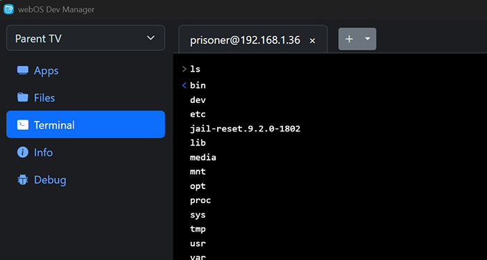 ניתן להיכנס דרך האפשרות: “Terminal” באפליקציה שהתקנתם במחשב: webOS Dev Manager.