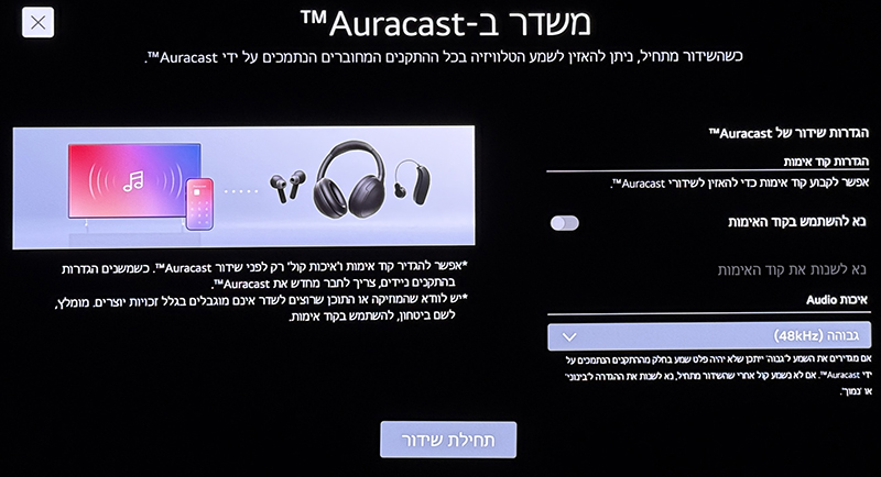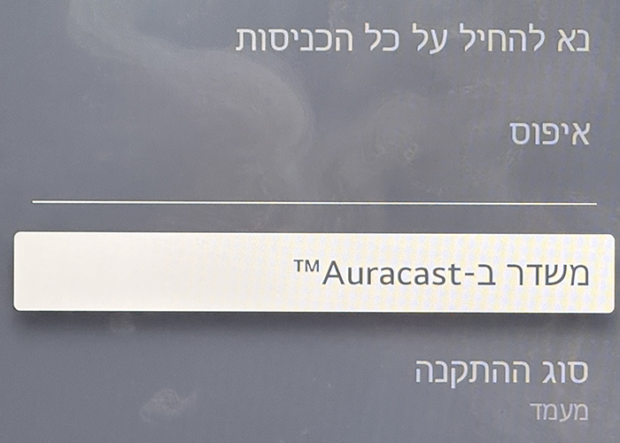 להפעלת משדר Auracast יש לעבור למסך ההגדרות בטלוויזיה -> צליל -> משדר ב-Auracast.