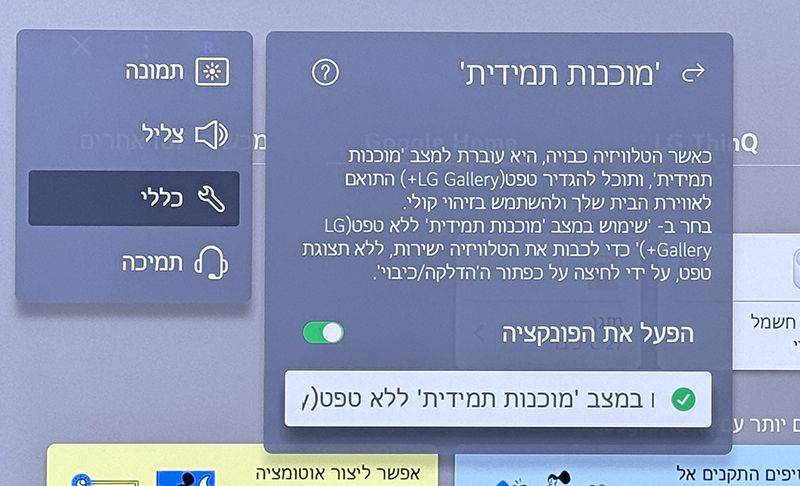 הפעלת “מוכנות תמידית” תשאיר את הטלוויזיה עובדת על חשמל נמוך גם כשהיא במצב כיבוי ובך ניהול הבית החכם ימשיך לעבוד גם כשהטלוויזיה כבויה.