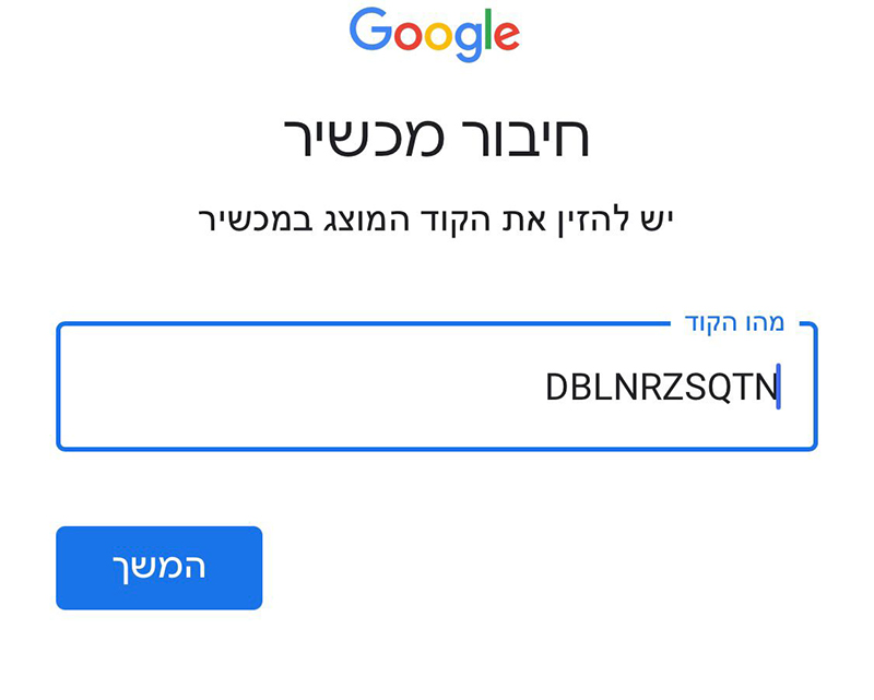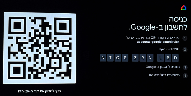 - יש לסרוק את הקוד QR או לעבור לכתובת: accounts.google.com/device ולהזין את הקוד של המסך.