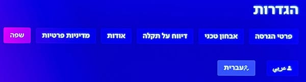 דרך מסך ההגדרות תוכלו למצוא את פרטי הגרסה, אבחון טכני, דיווח על תקלה ושינוי שפה (עברית, ערבית).